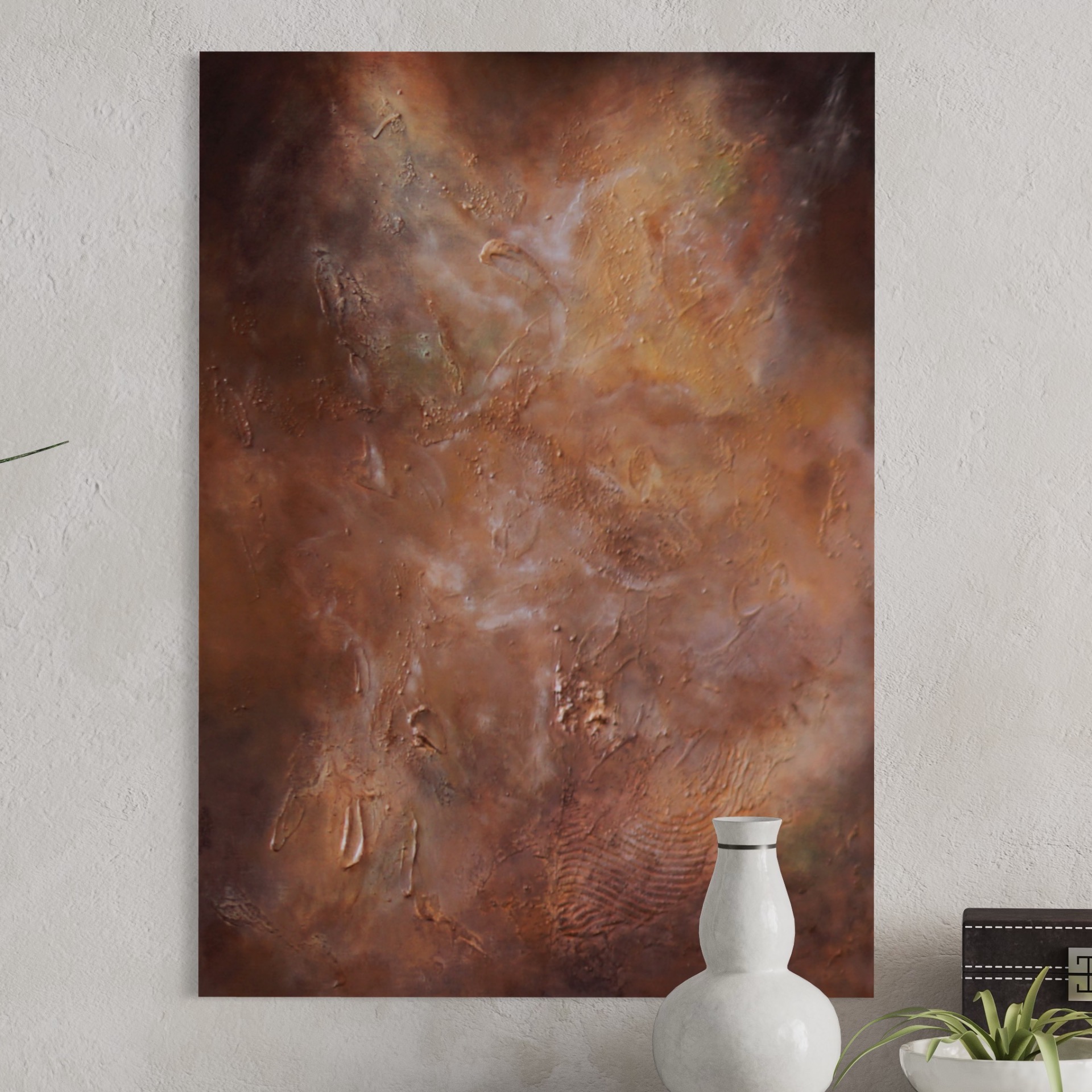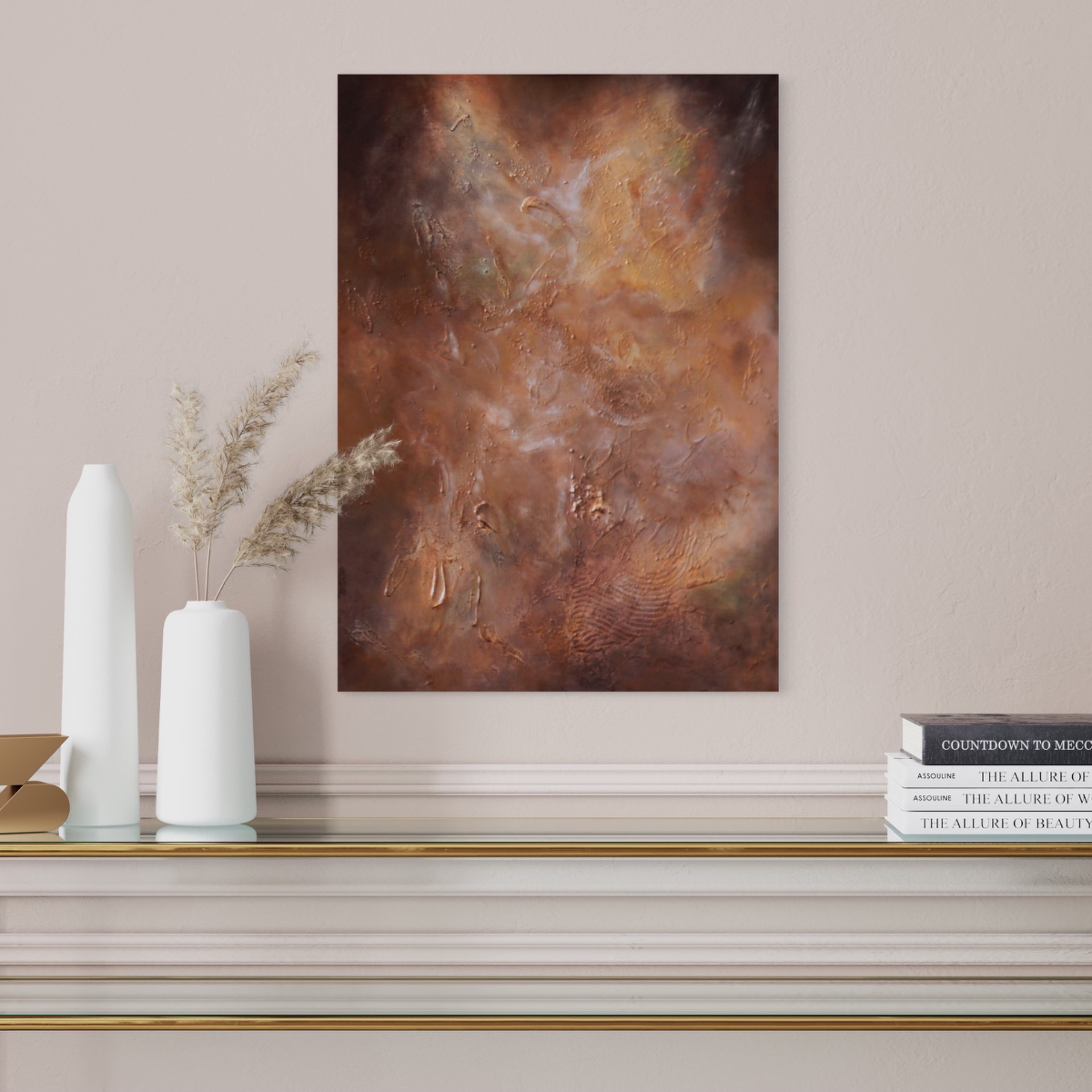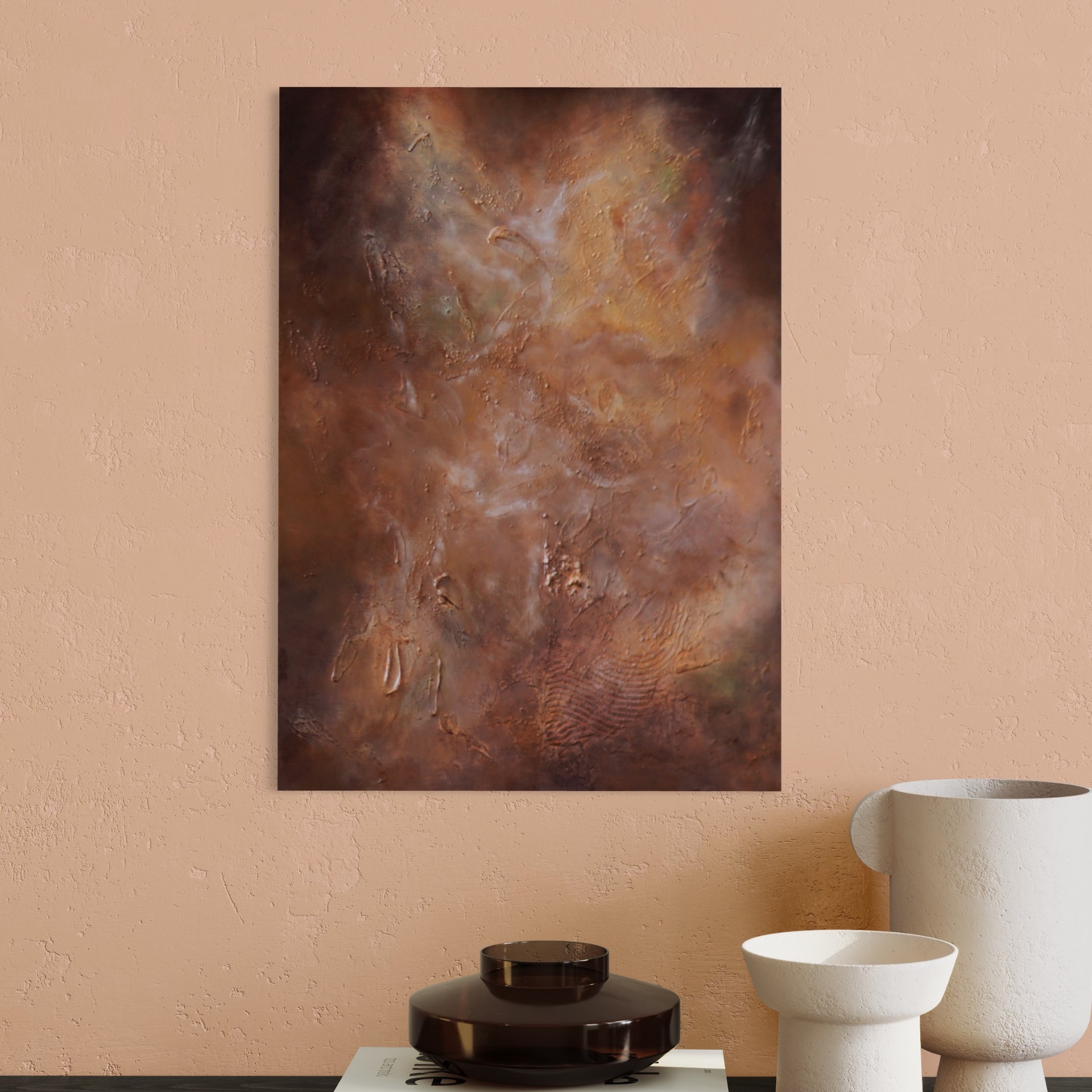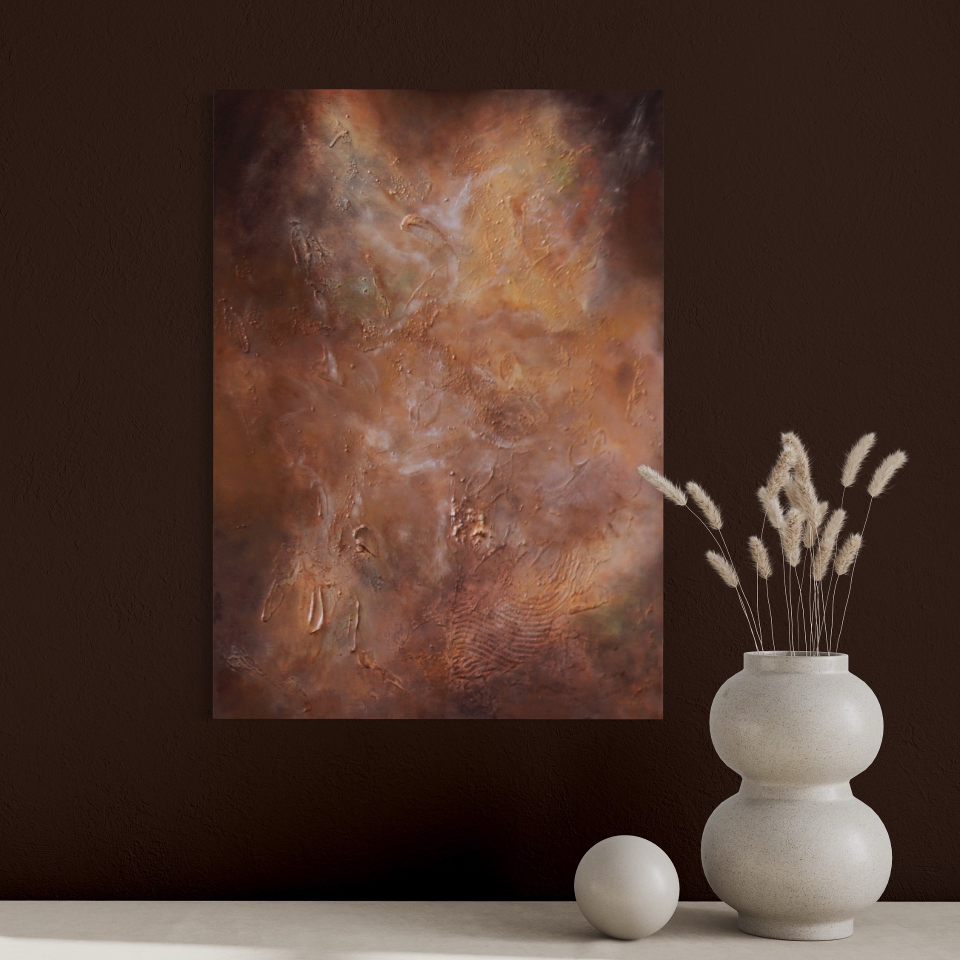 Starlit Galaxies on ruskeansävyinen, galaximainen abstrakti teos, jossa kohokuviot ja hiekkaista pinta luovat syvän ja kosmisen tunnelman. Uniikki tekstuuritaide moderniin kotiin.