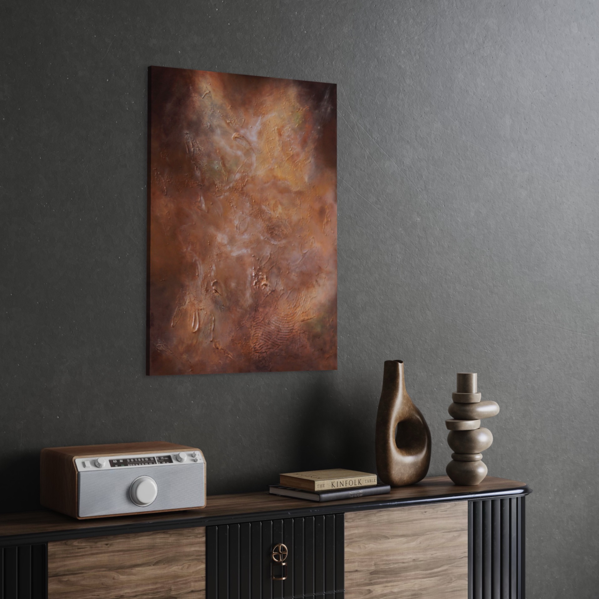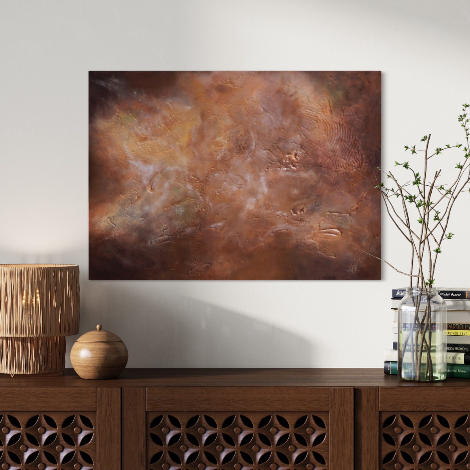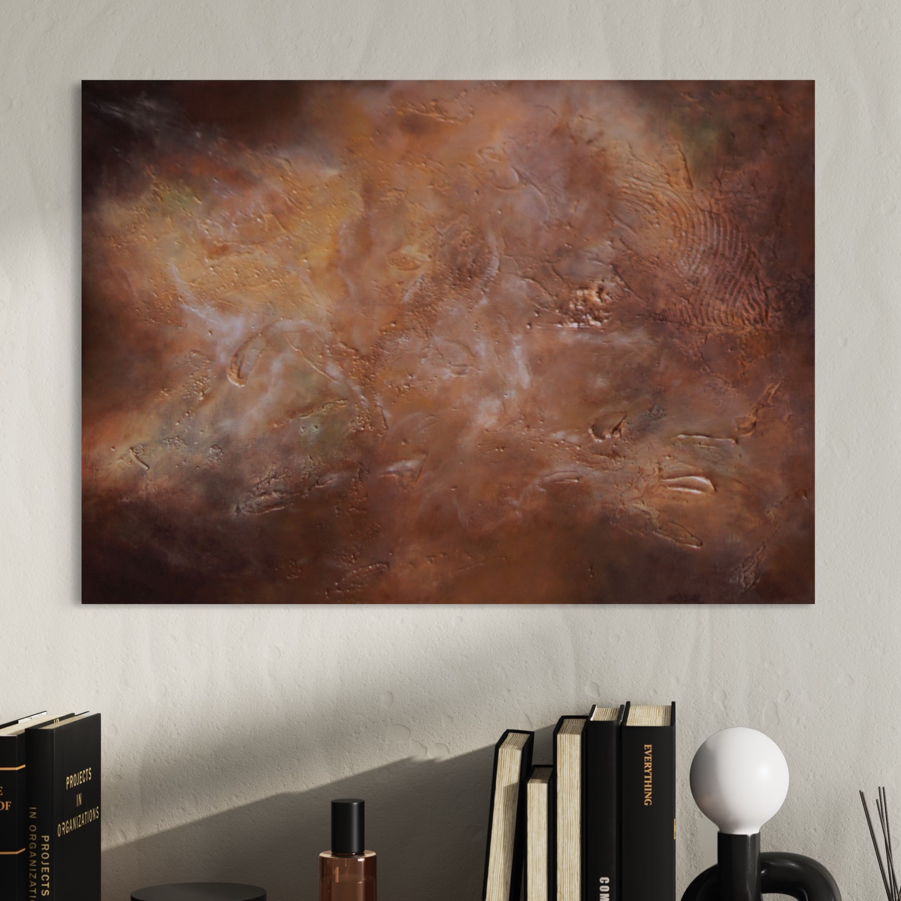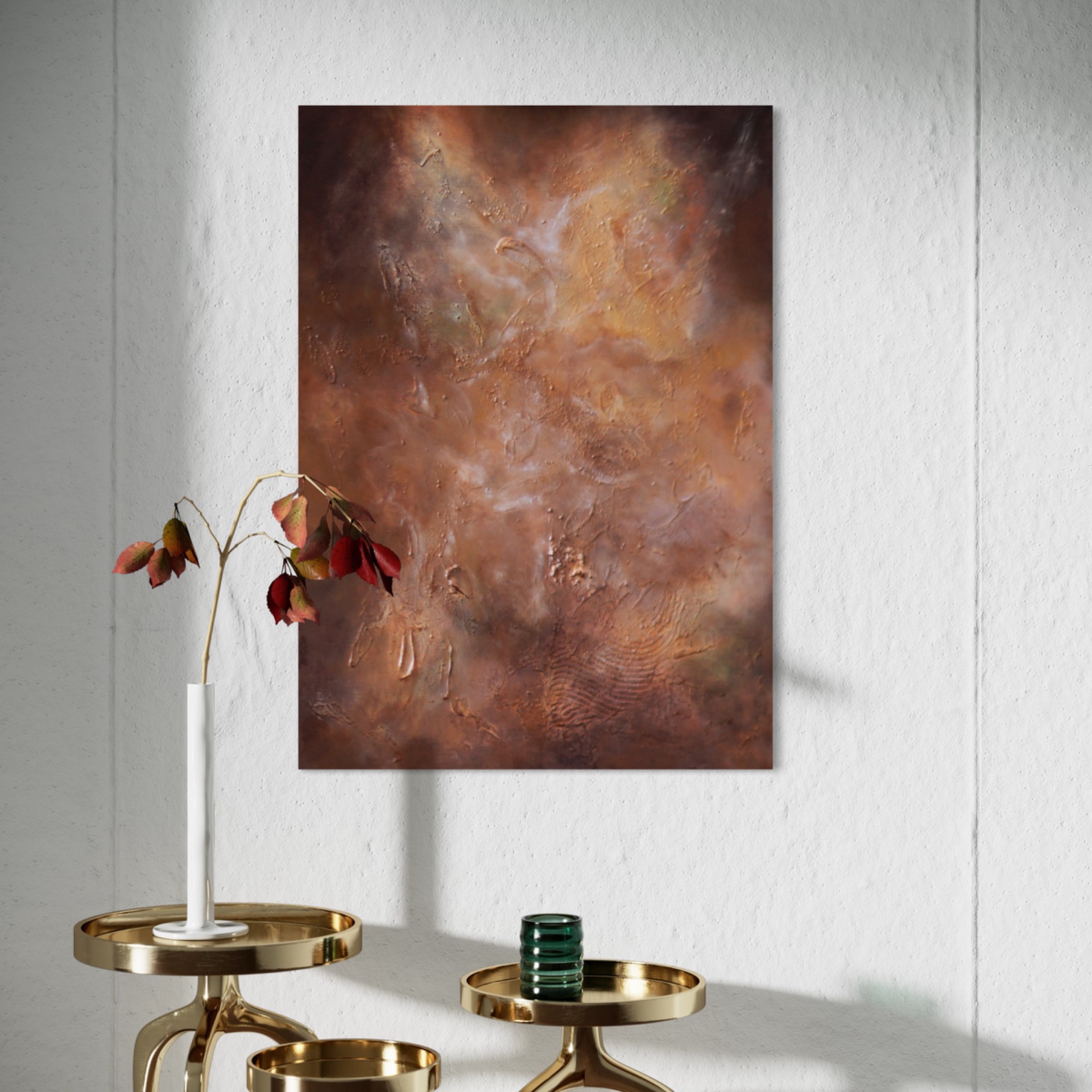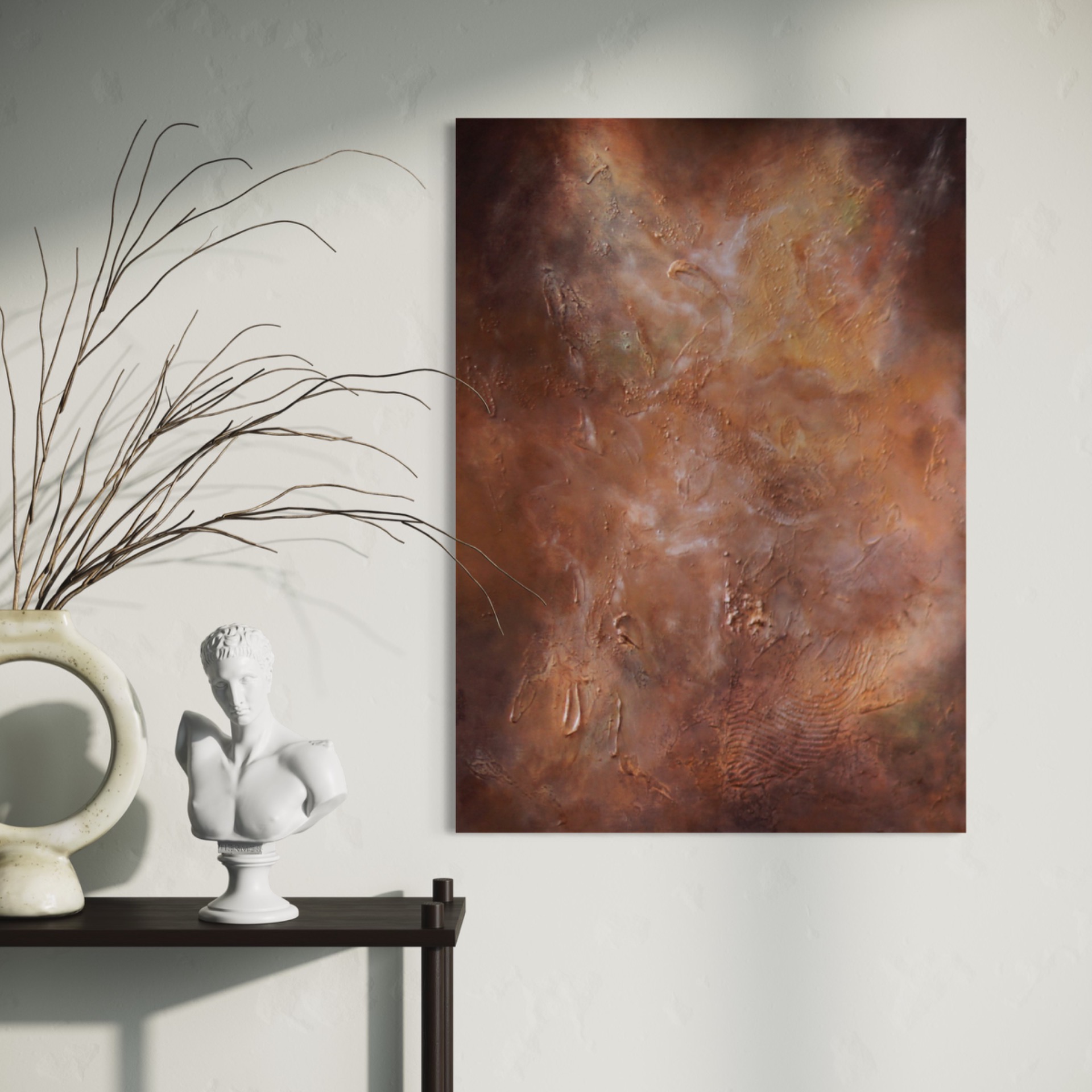 Starlit Galaxies on ruskeansävyinen, galaximainen abstrakti teos, jossa kohokuviot ja hiekkaista pinta luovat syvän ja kosmisen tunnelman. Uniikki tekstuuritaide moderniin kotiin.